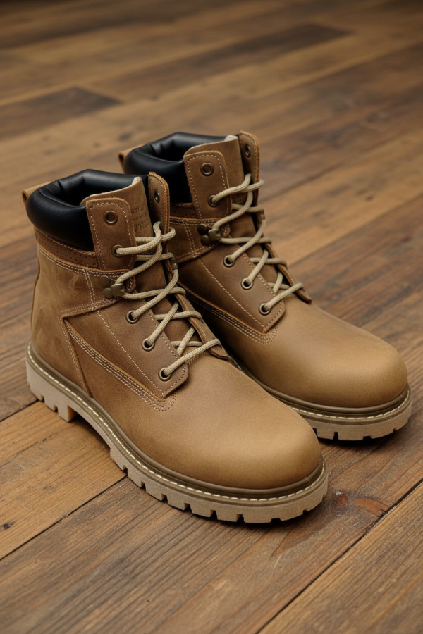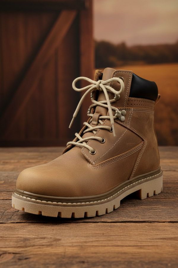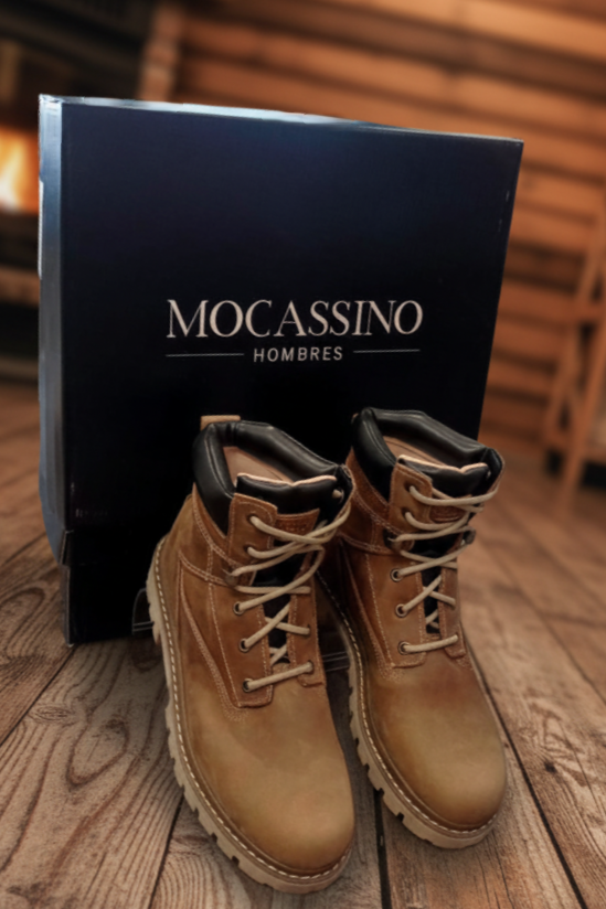 El Borceguí Mocassino en cuero vacuno engrasado marrón y con cuello acolchado negro, presenta una fabricación robusta con cordones resistentes, costuras reforzadas y suela tipo tractor de alto agarre. Es un calzado que combina durabilidad, protección, y diseño. Su versatilidad es amplia, pudiéndose usar para trabajo diario intensivo, para actividades recreativas al aire libre, o para uso urbano cotidiano.