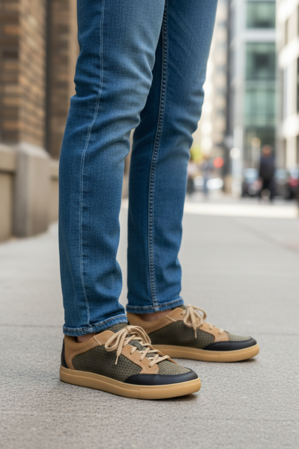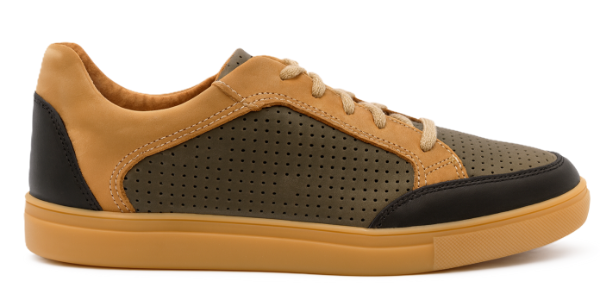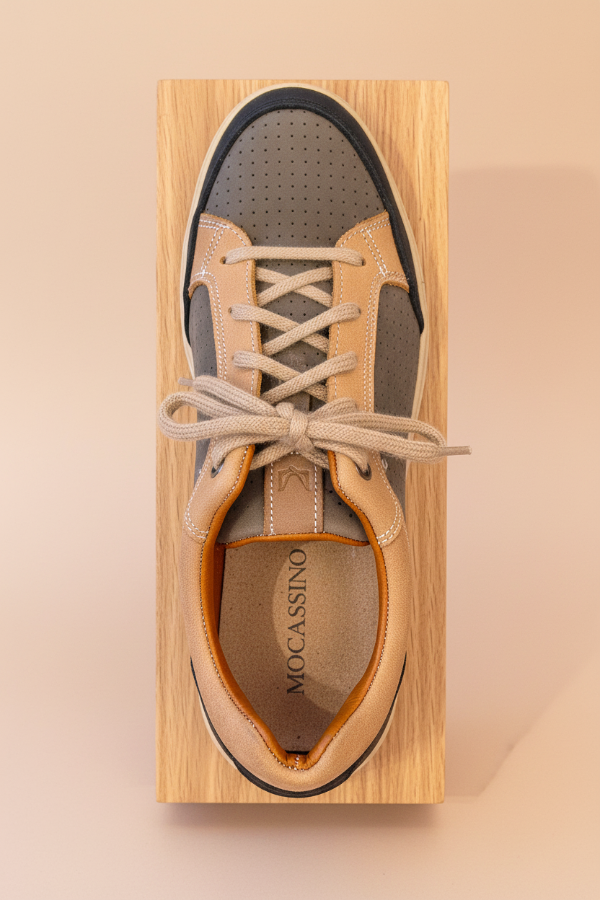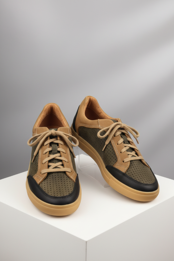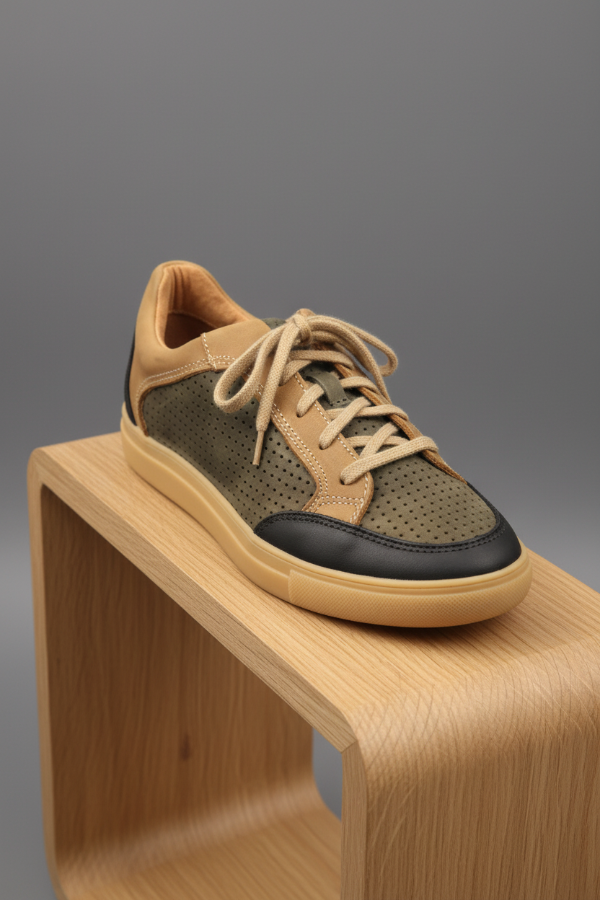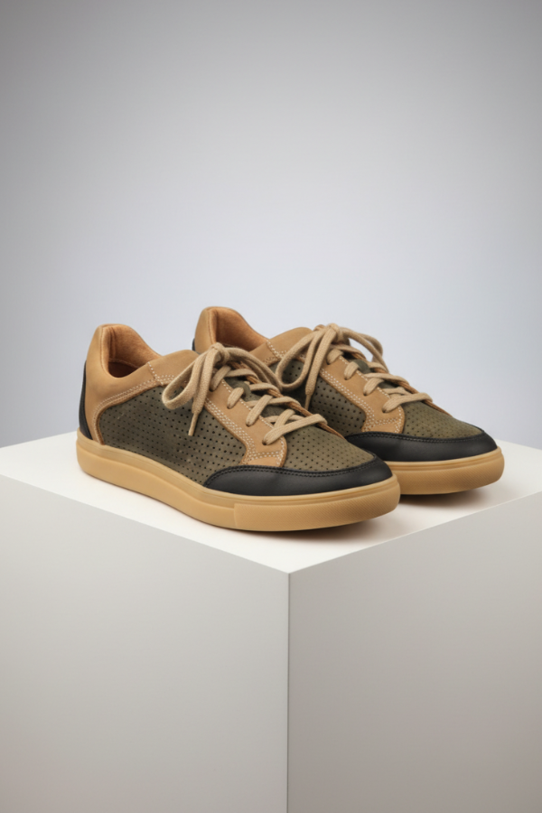 La Mocassino Pocolo Tricolor es una zapatilla urbana en cuero vacuno perforado verde musgo combinado con marrón camel y negro. Tiene un diseño clásico con suela de goma beige que brinda máxima comodidad. Presenta un estilo versátil que aporta un toque distintivo a cualquier look casual.